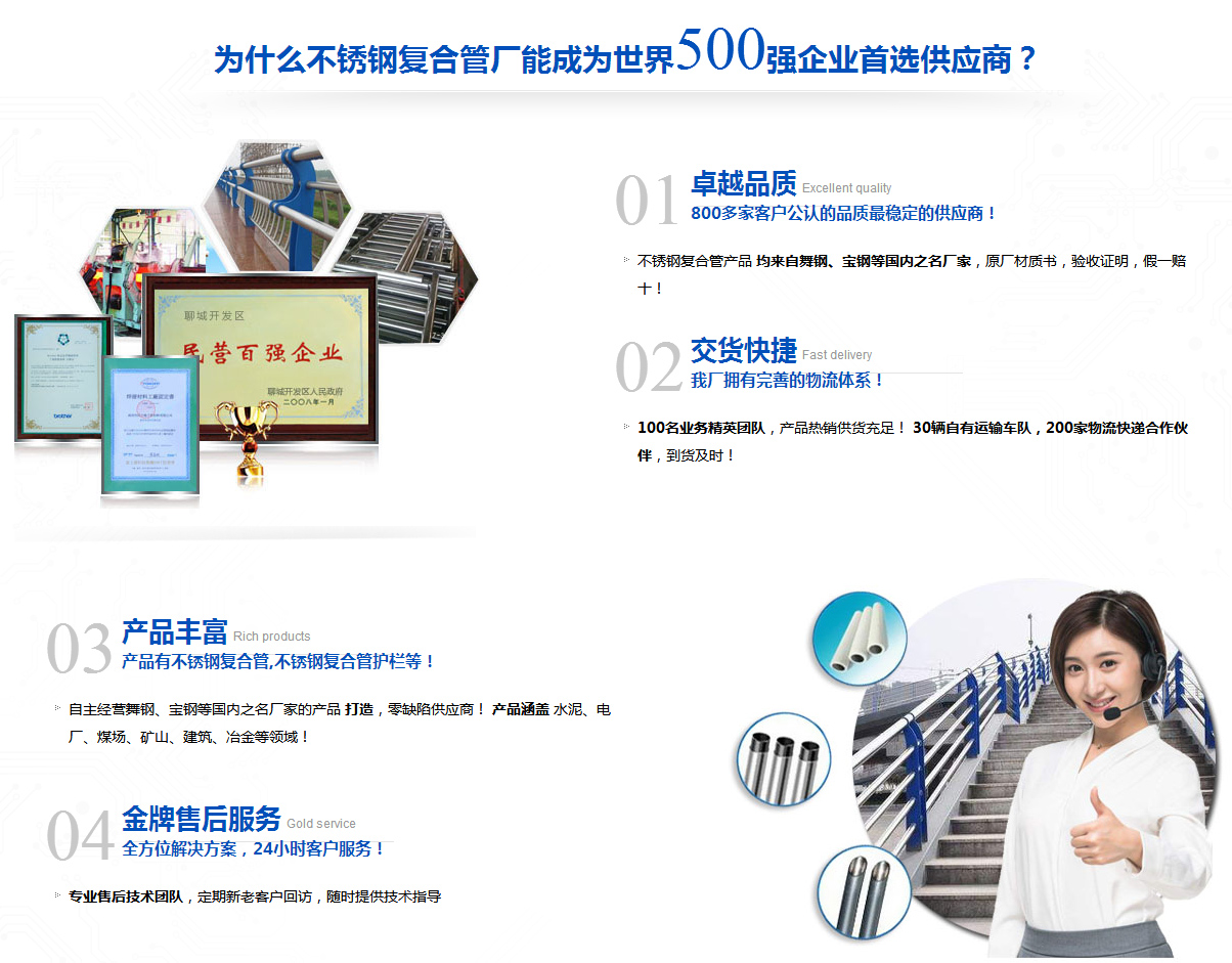 山東鑫旺通金屬制品有限公司座落在管材的生產(chǎn)基地--聊城市。 我公司引進(jìn)國(guó)外新技術(shù),專門(mén)生產(chǎn)不銹鋼復(fù)合管、不銹鋼復(fù)合管欄桿、不銹鋼/碳素鋼復(fù)合圓管、方管、橢圓管、橋梁護(hù)欄、景觀護(hù)欄等系列新型材料的企業(yè)。公司占地6萬(wàn)余平方米,設(shè)有生產(chǎn)基地、銷售公司、研發(fā)中心等機(jī)構(gòu),是一家集科、工、貿(mào)為一體的高新企業(yè)。公司外復(fù)不銹鋼復(fù)合管車間擁有八條自主知識(shí)產(chǎn)權(quán)生產(chǎn)線,專業(yè)從事外復(fù)不銹鋼/碳素鋼復(fù)合管生產(chǎn)及工程設(shè)計(jì)、制作、安裝、施工。先進(jìn)的生產(chǎn)工藝和嚴(yán)格的檢測(cè)手段,使企業(yè)產(chǎn)品全部通過(guò)不銹鋼復(fù)合管國(guó)家標(biāo)準(zhǔn)(GB/T18704-2008)。